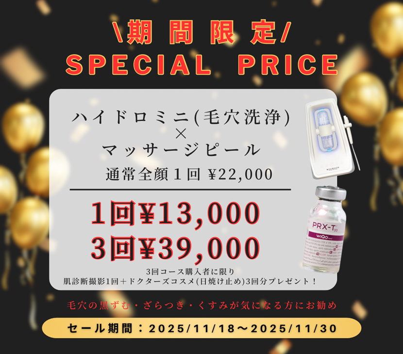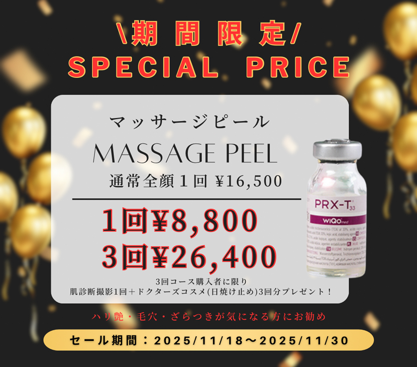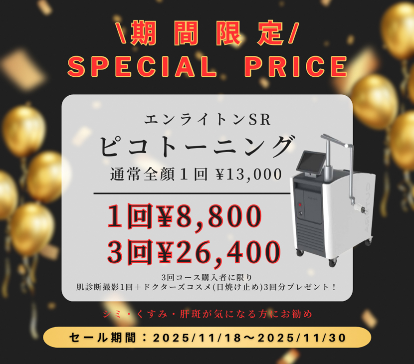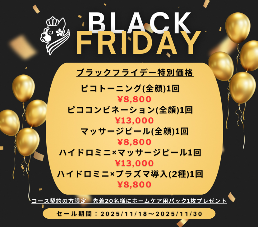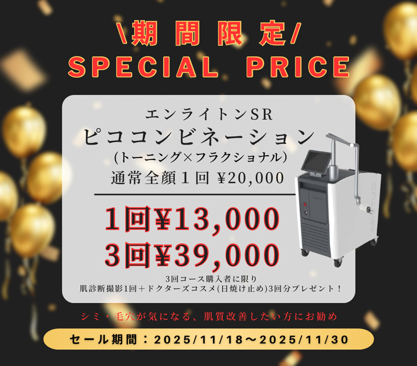 施術キャンペーン 2025ブラックフライデー特別価格! ブラックフライデー特別価格! ブラックフライデー期間限定 特別価格 特別な5メニューを破格でご提供。 気になる施術をクリックして詳細へ。 1. ピコトーニング(全顔) 2. ピココンビネーション(全顔) 3. マッサージピール(全顔) 4. ハイドロミニ × マッサージピール 5. ハイドロミニ × プラズマ導入(2種) ピコトーニング(全顔) ピココンビネーション(全顔) マッサージピール(全顔) ハイドロミニ × マッサージピール ハイドロミニ × プラズマ導入(2種)