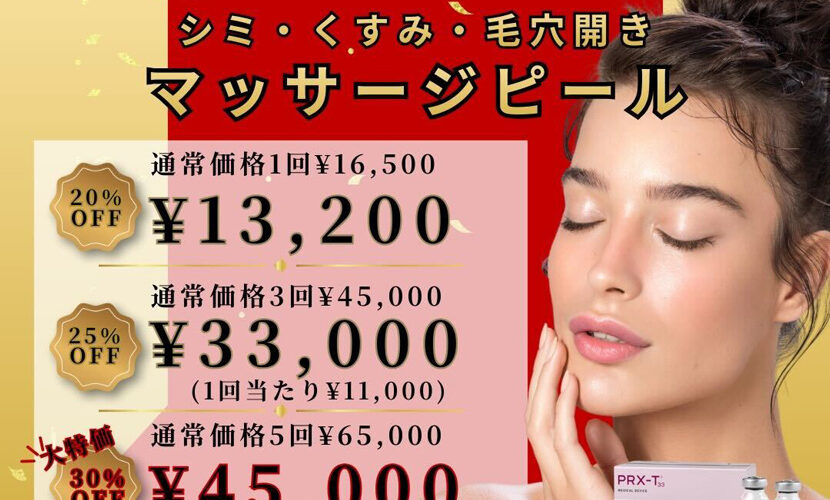 施術キャンペーン マッサージピール 艶肌、くすみ・ざらつき改善には最強なピーリング! マッサージピール ダウンタイムを抑えながら、ハリ・ツヤ・透明感を引き出す次世代ピーリング。皮膚表面を剥離せず、真皮層に働きかけることでコラーゲン生成を促進します。 コウジ酸配合により、美白ケアも同時に可能。くすみ、ハリ不足、小じわが気になる方におすすめの施術です。 「肌に負担をかけずに、確かな変化を感じたい」そんな方に選ばれています。 ご予約はこちら