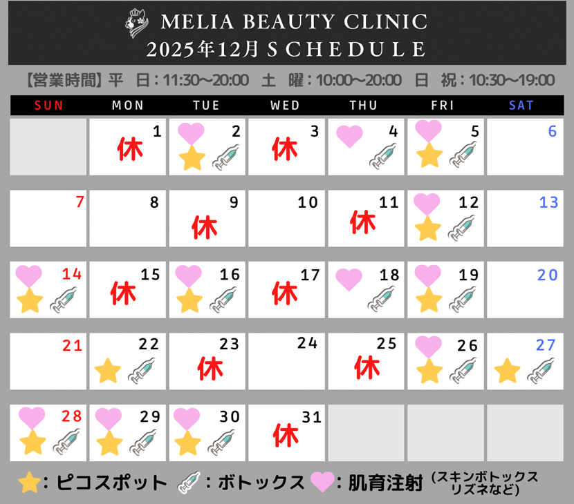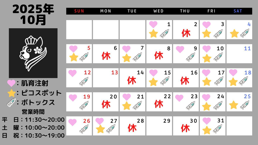 10月休診日のお知らせ 営業時間:平日 11:30〜20:00/土曜 10:00〜20:00/日祝 10:30〜19:00 🩷:肌育注射施術可能日 :ピコスポット施術可能日 💉:ボトックス施術可能日 11月休診日のお知らせ 次の記事